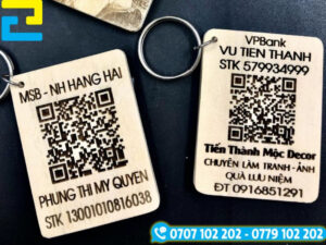 - Móc khóa in mã QR chất liệu gỗ được làm từ gỗ thông hoặc gỗ ép có độ dày khoảng 3mm – 6mm trọng lượng nhẹ và được cắt laser theo hình dáng mà khách hàng mong muốn. Mã QR được khắc lên bề mặt móc khóa một cách sắc nét nhờ công nghệ khắc laser hoặc in màu bằng công nghệ in UV hiện đại.