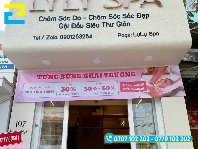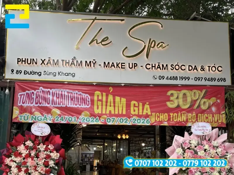 - Băng rôn quảng cáo: Đây sẽ là ấn phẩm giúp spa thu hút khách hàng từ xa một cách nhanh nhất. Nếu như backdrop chúng ta cần để những khoảng trống để khách check-in thì những băng rôn quảng cáo sẽ giúp doanh nghiệp quảng cáo hiệu quả hơn. Ngoài ra, sau khi lễ khai trương xong, chúng ta có thể tiếp tục treo băng rôn trong vài ngày chứ không nhất thiết phải tháo dỡ như backdrop, background.