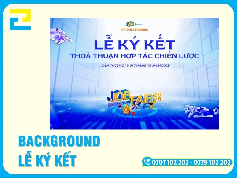 In phông nền, backdrop, background lễ ký kết là dịch vụ sử dụng công nghệ in kỹ thuật số hiện đại trên các chất liệu như bạt Hiflex, PP, Canvas để tạo nên không gian sự kiện trang trọng. Đây là giải pháp tối ưu giúp định vị thương hiệu, ghi lại những khoảnh khắc hợp tác quan trọng và tăng tính chuyên nghiệp cho buổi lễ.
