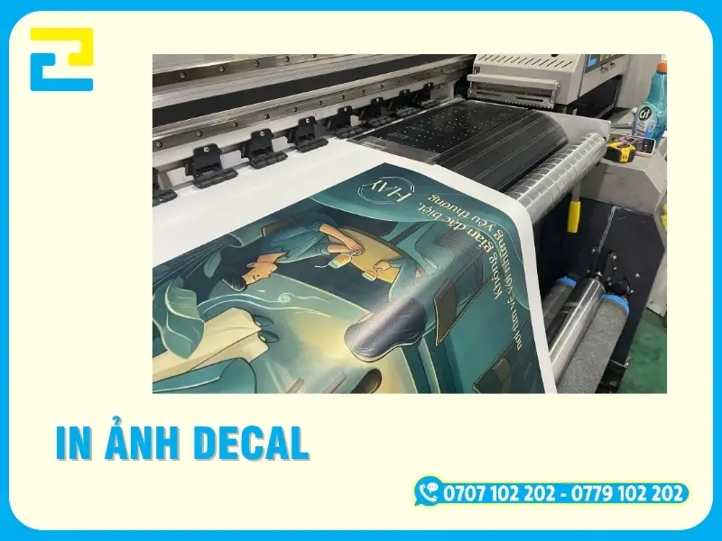 In ảnh decal là kỹ thuật in kỹ thuật số hoặc in UV sử dụng mực để thể hiện hình ảnh, nội dung lên một loại nhãn tự dính có sẵn lớp keo ở mặt sau. Sản phẩm sau khi hoàn thiện có thể dán trực tiếp lên các bề mặt phẳng hoặc cong như kính, gỗ, nhựa, kim loại thông qua một lực ấn nhẹ. Khác với các loại nhãn khác, decal không cần làm ướt hay hơ nóng để kích hoạt lớp keo, giúp tối ưu hóa thời gian và sự tiện lợi trong thi công.