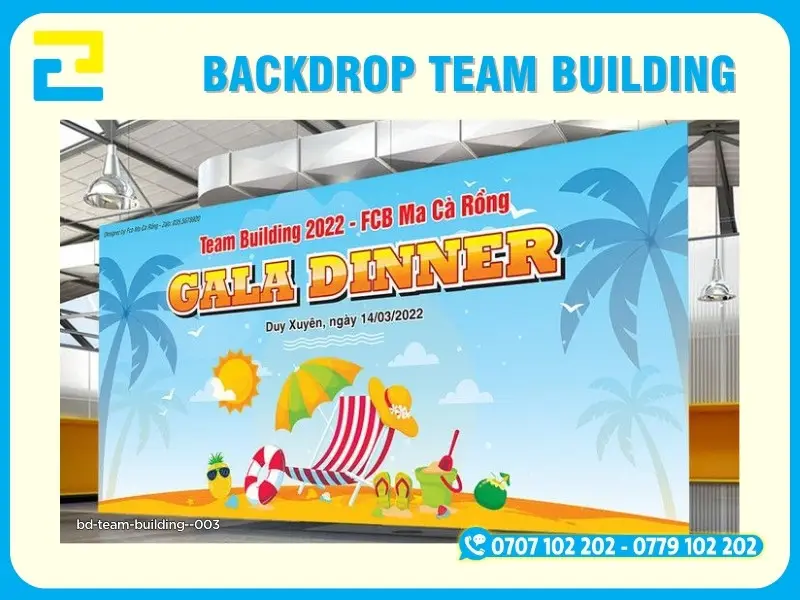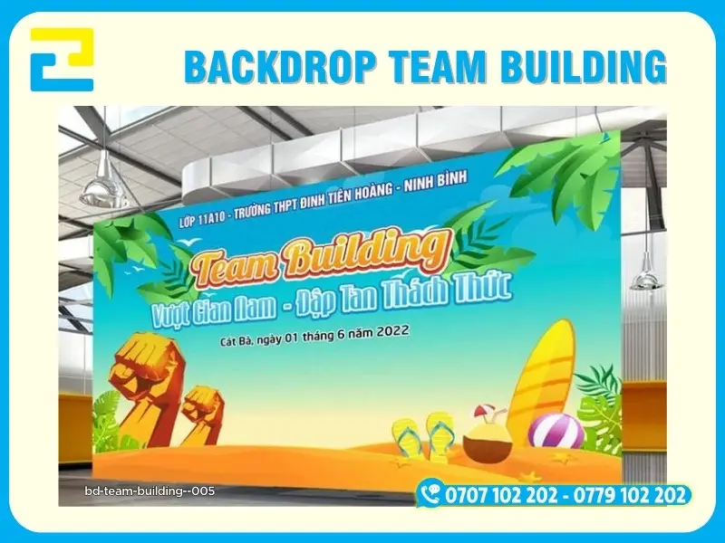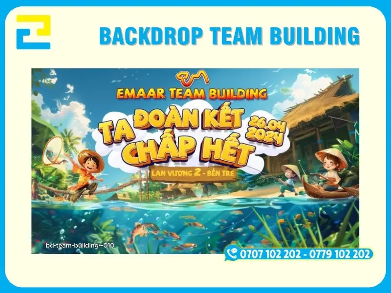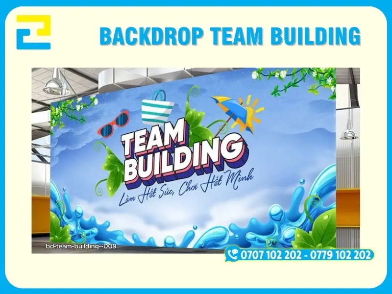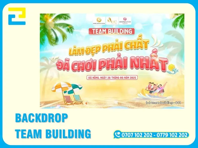 Backdrop team building là hạng mục không thể thiếu cho các sự kiện team building, du lịch công ty, hoạt động gắn kết tập thể trong nhà và ngoài trời. Backdrop không chỉ giúp truyền tải đầy đủ thông tin sự kiện mà còn tạo điểm nhấn chuyên nghiệp, là khu vực check-in quan trọng để lưu giữ những khoảnh khắc đáng nhớ của tập thể.
