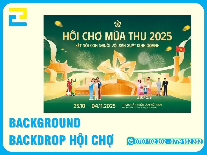 background, backdrop, phông nền được treo trên sân khấu, các khu vực sự kiện của hội chợ, gian hàng,… sẽ giúp mang đến một không gian chuyên nghiệp hơn. Những nội dung, hình ảnh được in đã được thiết kế sẵn, chứa đựng nội dung liên quan đến sự kiện hội chợ. Thông qua đó cũng sẽ góp phần quảng cáo và thu hút người nhìn, thu hút khách hàng .
