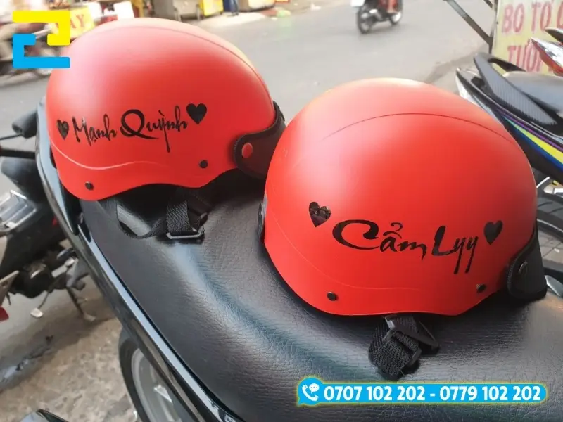 - Nhận in decal theo yêu cầu: logo thương hiệu, hình ảnh, slogan, họa tiết thiết kế riêng… với nhiều kích thước, màu sắc và phong cách khác nhau, phù hợp cho mũ bảo hiểm thời trang, mũ bảo hiểm đồng phục, quà tặng quảng cáo.