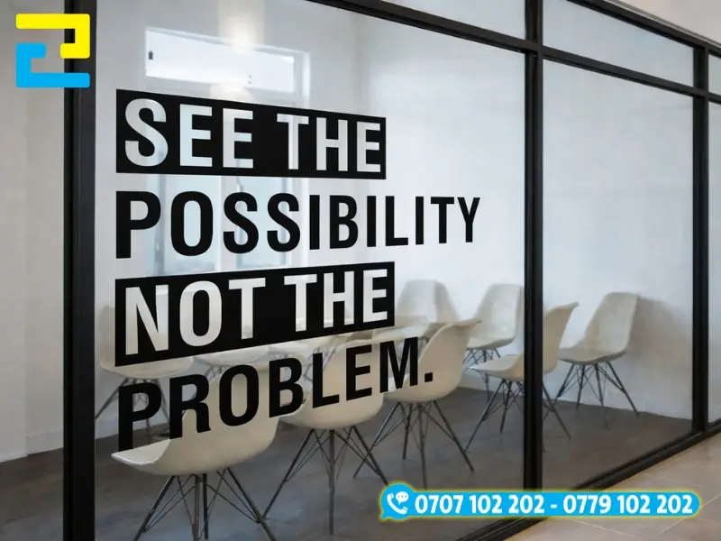 Decal mờ là giải pháp tối ưu để tạo không gian riêng tư mà vẫn giữ được sự tinh tế, trang nhã. Thay vì quảng cáo rực rỡ, loại decal này tập trung vào tính ứng dụng cho vách ngăn văn phòng, kết hợp cùng kỹ thuật cắt chữ hoặc in logo mờ để tăng tính chuyên nghiệp và thẩm mỹ cho môi trường làm việc.