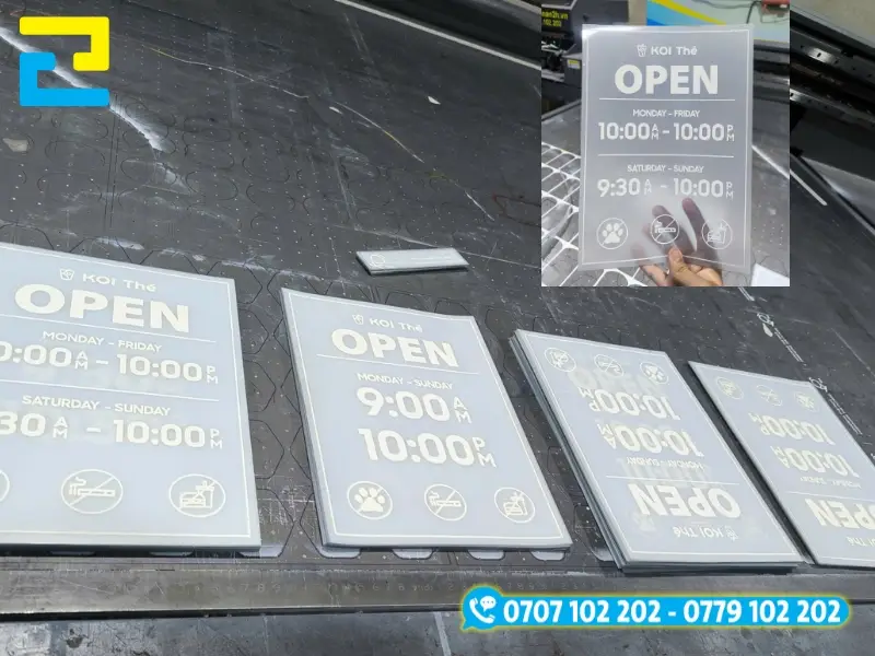 Decal trong in nội dung trắng dán kính trước cửa hàng