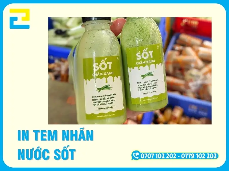 Nước sốt — từ sốt cà chua, sốt ớt, sốt BBQ đến sốt hải sản — luôn chứa dầu, axit và nước trong thành phần. Tem nhãn dán trên chai hoặc hũ nước sốt phải chịu được dầu bắn, ẩm ướt và nhiệt độ cao khi bảo quản trong bếp; chọn sai chất liệu thì tem ố vàng chỉ sau vài tuần. Kinh nghiệm 8 năm chạy file cho các xưởng nước chấm và gia vị, tôi luôn khuyên decal PVC hoặc PP dày 80–100 micron — bám chắc chai thủy tinh lẫn hũ nhựa. In Ấn 2H in bằng mực eco-solvent 1440 dpi, cán bóng chống trầy, trả hàng 2 giờ tại TP.HCM. Gọi 0707.102.202 để ra mẫu ngay.