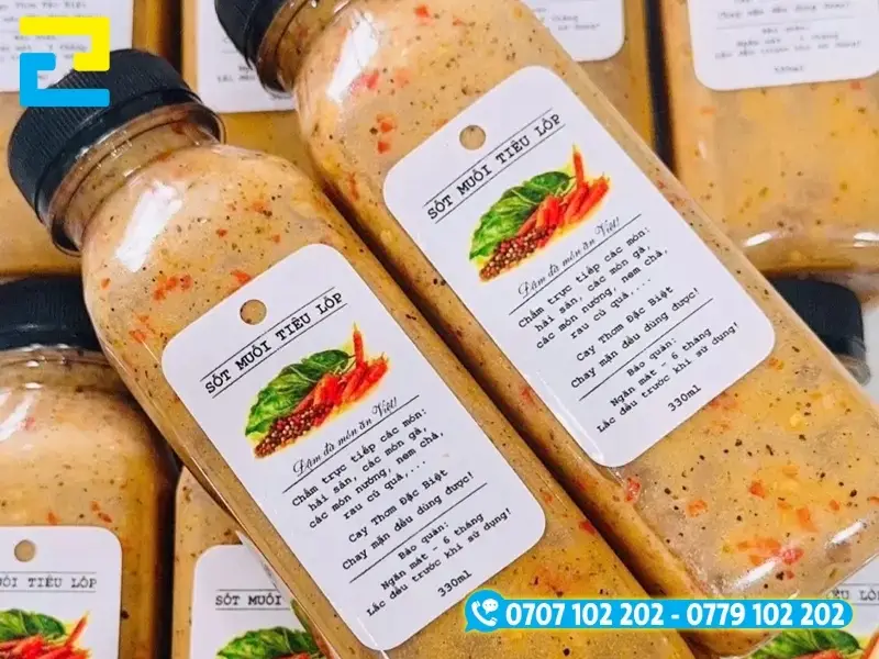 - Phân biệt sản phẩm: Sốt ớt, sốt cà chua, sốt BBQ, sốt hải sản — mỗi loại cần tem nhãn khác biệt về màu sắc và hình ảnh để khách nhận diện nhanh trên kệ.