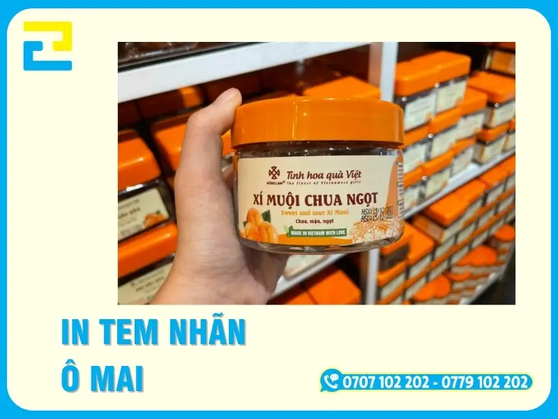 Ô mai — mận dẻo, xí muội, ô mai gừng, ô mai cam thảo — là dòng thực phẩm khô truyền thống nhưng hút ẩm rất mạnh. Tem nhãn ô mai phải chịu được môi trường ẩm bên trong hộp, không bong khi bề mặt hộp nhựa đọng hơi nước, và ghi đầy đủ thông tin VSATTP bắt buộc. Sau 8 năm chạy file cho hàng trăm cơ sở ô mai từ Hà Nội đến TP.HCM, xưởng In Ấn 2H khẳng định: decal nhựa sữa 90–120 micron là chất liệu tối ưu nhất. Chúng tôi in bằng mực eco-solvent 1440 dpi, cán bóng chống ẩm, cắt bế die-cut và trả hàng 2 giờ. Gọi ngay 0707.102.202.