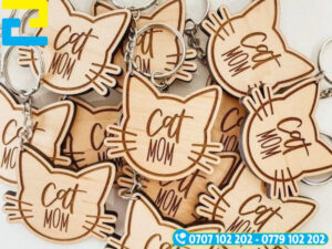- Móc khóa con mèo chất liệu gỗ được làm từ gỗ tự nhiên hoặc gỗ ép MDF có độ dày 3mm đến 5mm, bề mặt được xử lý nhẵn mịn, dễ dàng khắc laser hoặc in hình ảnh theo yêu cầu của khách hàng.