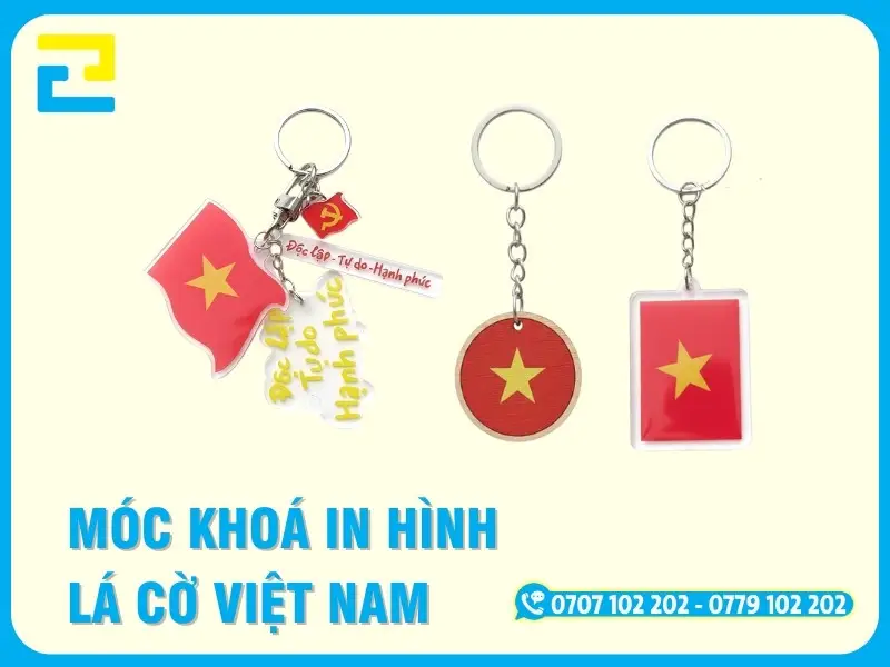 Móc khóa in hình lá cờ Việt Nam là lựa chọn hoàn hảo để thể hiện tình yêu nước, niềm tự hào dân tộc, đồng thời được sử dụng như một món quà tặng, quà lưu niệm ý nghĩa hoặc phụ kiện xinh xắn treo trên balo, túi xách, chìa khóa. Với chất liệu đa dạng như mica và gỗ bền đẹp, được thiết kế linh hoạt theo yêu cầu của khách hàng.